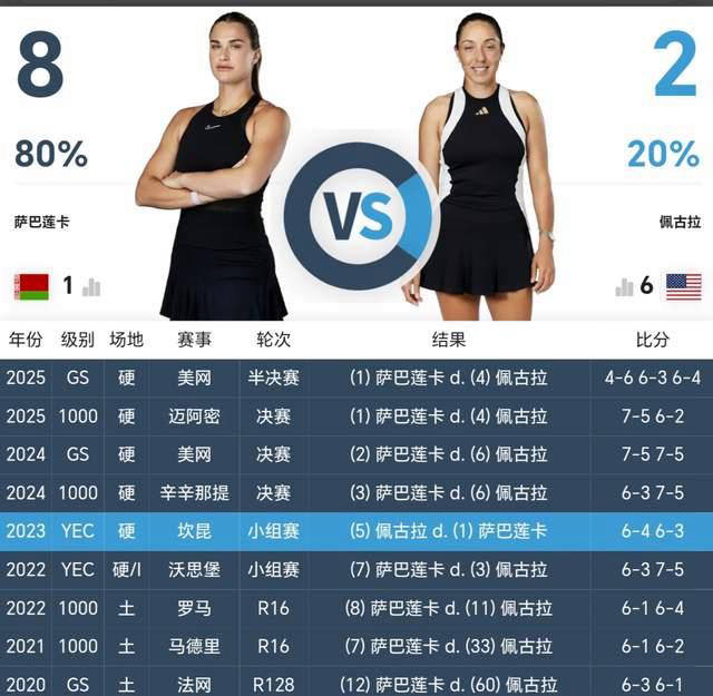 在过去的10次交锋中,萨巴伦卡以8胜2负占据明显优势,并且已经连续四次战胜富家女,最近一次碰面是今年美网半决赛,世界第一在丢掉一盘的情况下逆转获胜。